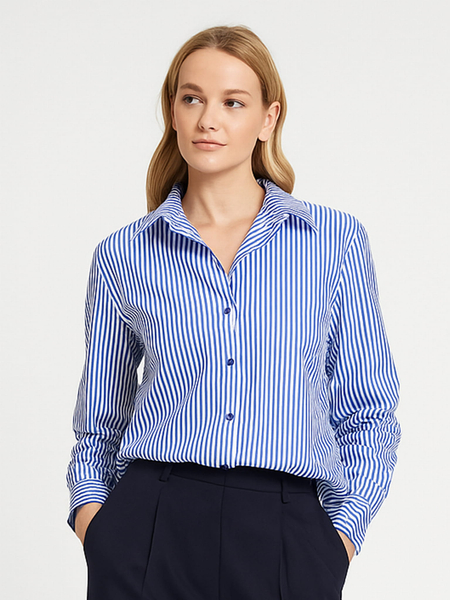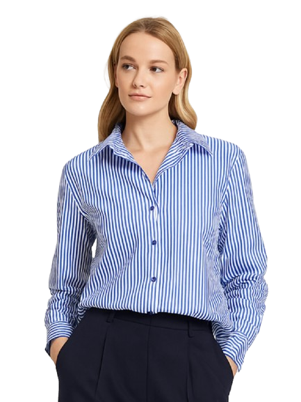 Klasyczna, a zarazem pełna świeżości – ta koszula z wysokogatunkowej bawełny to idealny wybór zarówno do pracy, jak i na co dzień. Delikatny, pionowy wzór w kobaltowo-białe paski optycznie wysmukla sylwetkę, a oddychająca tkanina zapewnia komfort noszenia przez cały dzień.