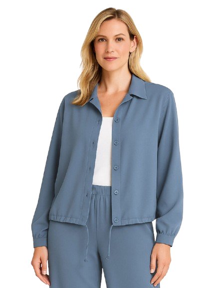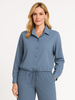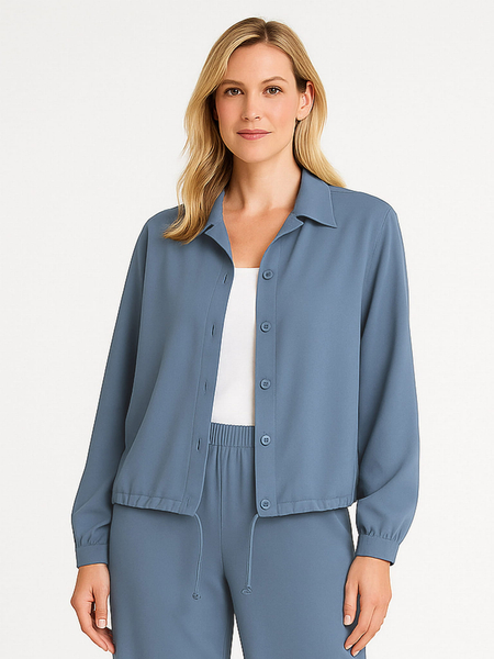 Koszulowa kurtka damska z wiskozy to elegancki i wygodny element garderoby, który możesz nosić zarówno samodzielnie, jak i w komplecie ze spodniami uszytymi z tej samej tkaniny. Lekko luźny fason z kołnierzykiem, zapinany na guziki, został wykończony tunelem ze sznurkiem w pasie, co nadaje sylwetce lekkości i subtelnie ją modeluje.