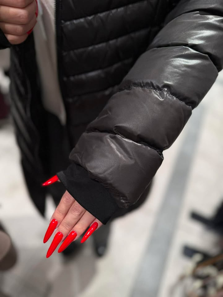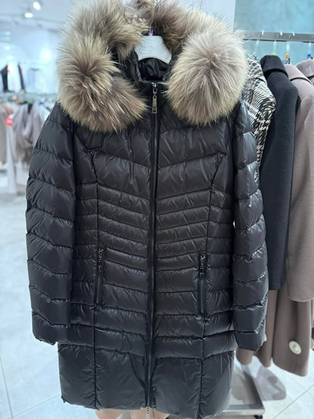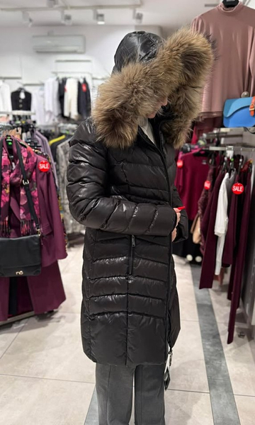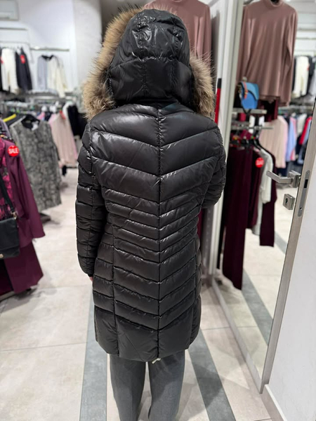 Nowoczesna i efektowna kurtka o wydłużonej formie, sięgająca za kolana, w kolorze klasycznej czerni. Wykonana z tkaniny poliestrowej o delikatnym połysku. Wypełnienie naturalnym pierzem zapewnia doskonałą ochronę przed chłodem, wiatrem i mrozem. Modne pikowania potęgują efekt ochrony przed zimnem ale też wyszczuplają sylwetkę. Prosty, lekki krój. Obszerny dosuwany kaptur wykończony dosuwaną listwą z naturalnego futra z jenota gwarantuje elegancki i luksusowy wygląd. Całość zapinana na dwustronny suwak w kolorze ciemnego niklu. Posiada dwie kieszenie zapinane na suwak. Długość płaszcza do kolan. Prosta, uniwersalna forma sprawdza się w wielu połączeniach – zarówno ze stylem eleganckim, jak i sportowym. Wygląda równie dobrze na różnych typach sylwetek. Ponadczasowy fason sprawdzi się przez wiele lat.