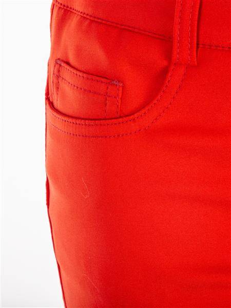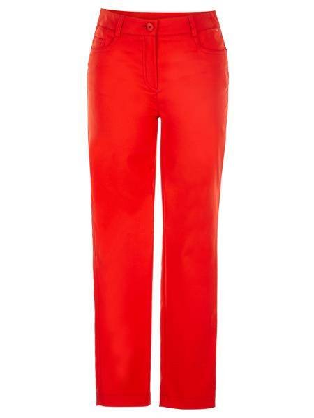 - Spodnie o klasycznym kroju z gładkiej elastycznej tkaniny wiskozowej w kolorze czerwonym. Z rozporkiem w przodu. Z kieszeniami.