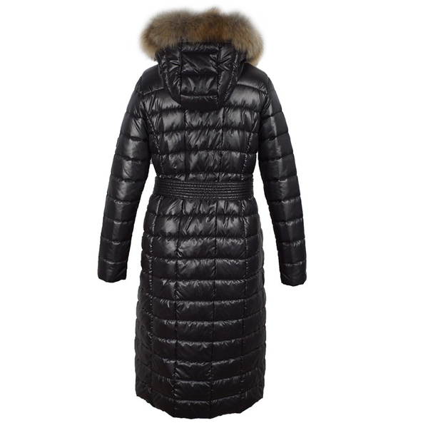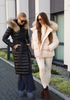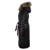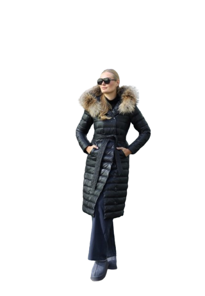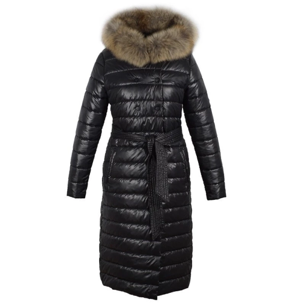 Nowoczesna i efektowna kurtka o wydłużonej formie w klasycznym czarnym kolorze. Wykonana z tkaniny poliestrowej o delikatnym połysku. Wypełnienie naturalnym pierzem, zapewnia doskonałą ochronę przed chłodem, wiatrem i mrozem. Modne pikowania potęgują efekt ochrony przed zimnem. Prosty, lekko dopasowany krój. Obszerny kaptur wykończony dosuwaną listwą z naturalnego futra z jenota gwarantuje elegancki i luksusowy wygląd. Całość zapinana na napy oraz dodatkowym atutem jest pasek w talli. Posiada dwie wpuszczone kieszenie. Długość płaszcza przed kostki gwarantuje ciepło w dolnej partii sylwetki. Prosta, uniwersalna forma sprawdza się w wielu połączeniach – zarówno ze stylem eleganckim, jak i sportowym. Wygląda również dobrze na różnych typach sylwetek. Ponadczasowy fason sprawdzi się przez wiele lat.