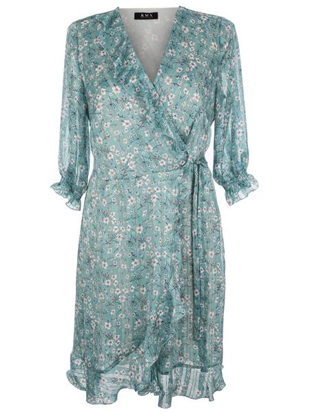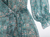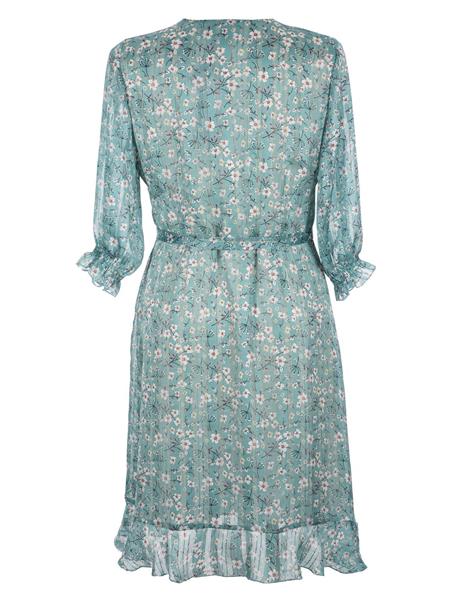 • Asymetryczna sukienka wiązana w pasie wykończona falbaną. Z tkaniny szyfonowej w drobny kwiecisty wzór w kolorze turkusowym ze srebrną nitką. Z dekoltem w szpic. Z rękawem 2/3 zakończonym ściągaczem. Na podszewce.