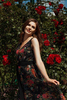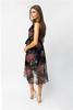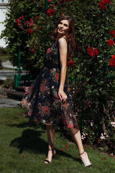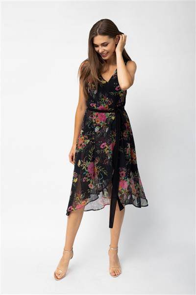 sukienka z wzorem kwiatów na czarnym tle. Linia rozkloszowana z elastyczną