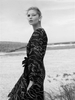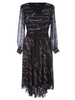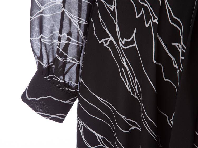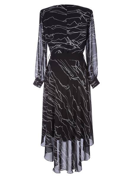 - Suknia wiązana z przodu z tkaniny szyfonowej w kolorze czarnym we wzór. Dekolt w szpic. Długi rękaw. Pasek. MODEL Z PROSTYM DOŁEM. Na podszewce.
