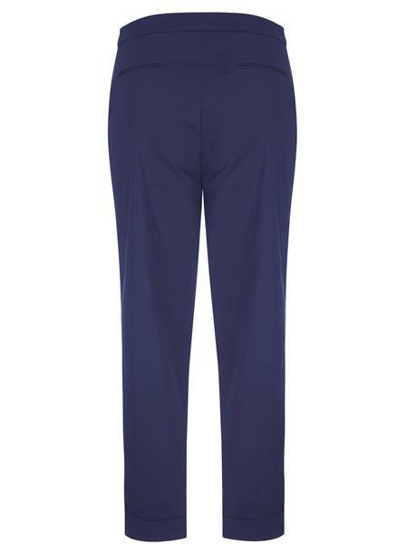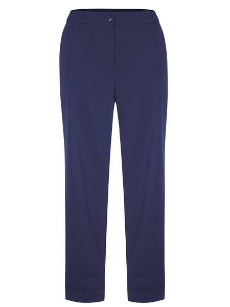 - Spodnie o prostym kroju z elastycznej tkaniny bawełnianej w kolorze granatowym. Kieszenie z boku i z tyłu. Nogawki z mankietami.