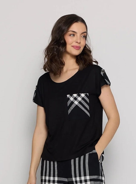 Czarna bawełniana bluzka marki Salko z krótkim rękawem to elegancka i wygodna propozycja na co dzień. Stylowy akcent stanowi kieszeń na piersi w białą kratę, dodająca charakteru i kontrastu. Wykonana z wysokiej jakości materiału, zapewnia komfort noszenia. Można skompletować ze spodniami w ten sam wzór kratki, tworząc spójny i modny zestaw. Idealna zarówno do casualowych, jak i bardziej eleganckich stylizacji.