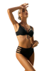 Prezentowane damskie figi kąpielowe z podwyższonym stanem, wykonane są w całości z gładkiej, czarnej tkaniny. Optycznie spłaszczają brzuch, ukrywając małe niedoskonałości sylwetki. Model majtek to sprawdzony fason, który został dodatkowo wzbogacony paseczkami po bokach, dzięki czemu prezentuje się niezwykle oryginalnie. Fason fig będzie odpowiedni dla kobiet, zarówno o szczupłej jak i nieco okrąglejszej pupie. Tył majtek pełny, dopasowuje się idealnie do sylwetki. Perfekcyjnie zaprojektowane o anatomicznym kroju, gwarantują prawdziwy komfort noszenia.