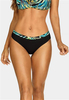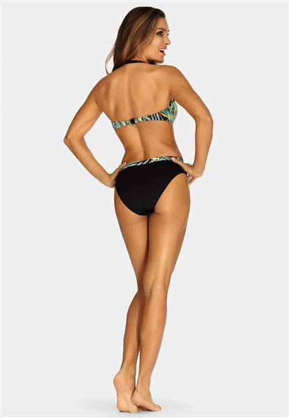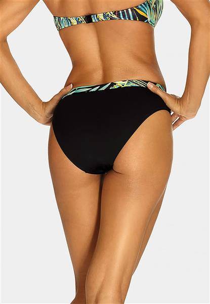 Majtki od kostiumu plażowego model FD20/834 wykonane z czarnego materiału, ozdobione szerszą lamówką wokół pasa. Ozdobna tkanina na pasie w tropikalny wzór ładnie łączy się z proponowanymi biustonoszami z tej linii. Damskie figi kąpielowe posiadają klasyczny, ponadczasowy, sprawdzony krój, który dopasowuje się do Twojej sylwetki. Perfekcyjnie zaprojektowane o anatomicznym kroju, gwarantują prawdziwy komfort noszenia.