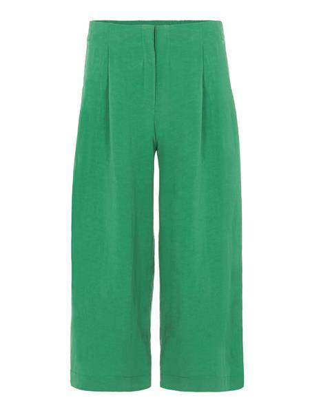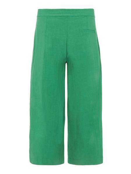 - Spodnie typu kuloty o delikatnie poszerzanym kroju z tkaniny wiskozowej z lnem w kolorze zielonym. Pojedyncza kieszeń z tyłu. Zapinane na kryty zamek i haftkę. Częściowo elastyczny pas i zaszewki z przodu.