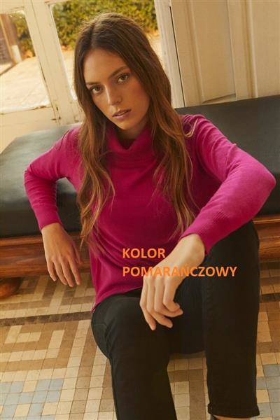 Sweter posiada na jednym ramieniu ozdobne sznurowanie.