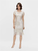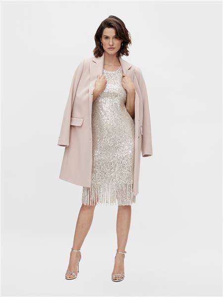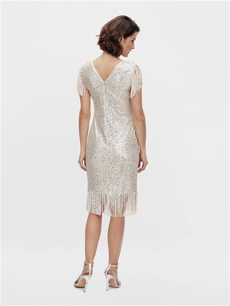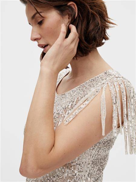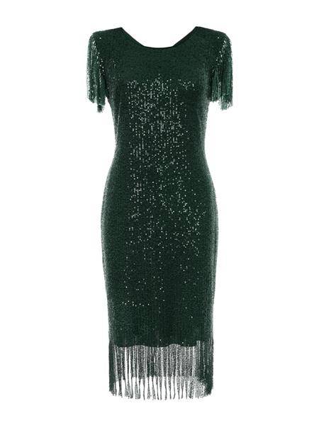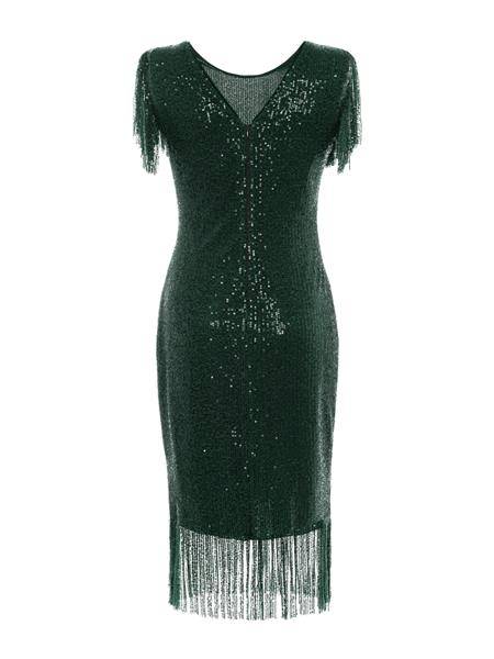 Sukienka o dopasowanym kroju z tkaniny cekinowej w kolorze ZIELONYM Okrągły dekolt z przodu i głęboki dekolt na plecach. Krótkie rękawki i dół sukienki z cekinowych frędzli. Zapięcie na kryty zamek z tyłu. Model na podszewce. Modelka ma 176 cm wzrostu