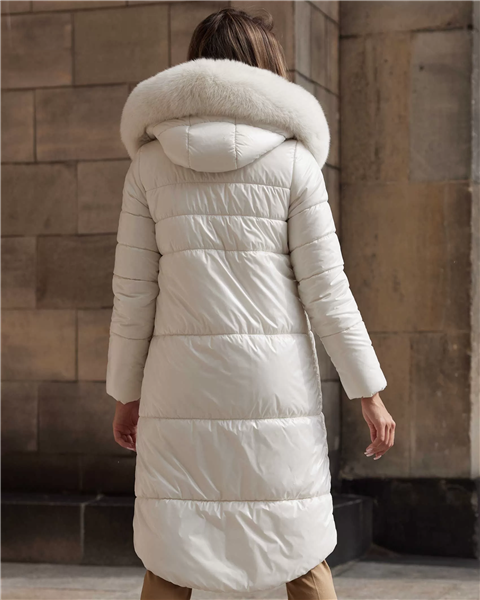 i szarości? Prezentowana tutaj mleczna kurtka puchowa z kapturem obszytym