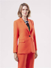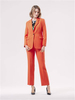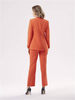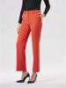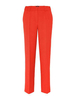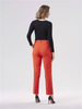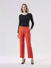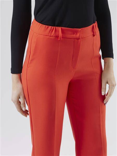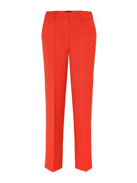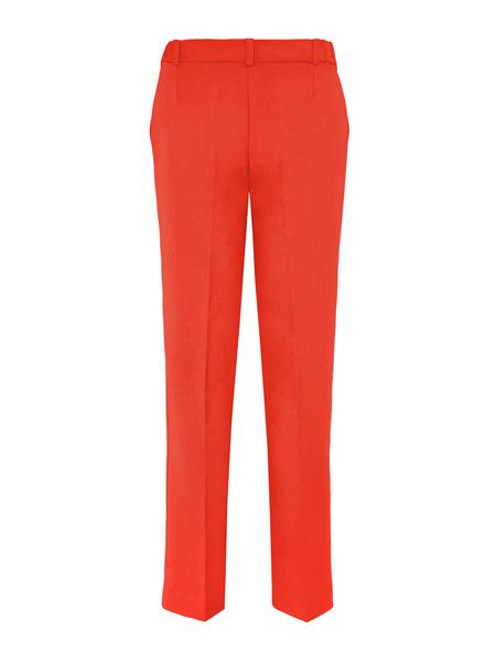 Spodnie o prostym kroju z elastycznej tkaniny wiskozowej w kolorze pomarańczowym. Kieszenie po bokach. Szlufki w pasie. Zapinane na zamek i haftkę.