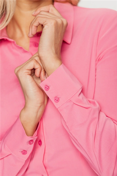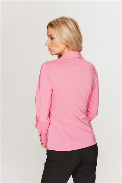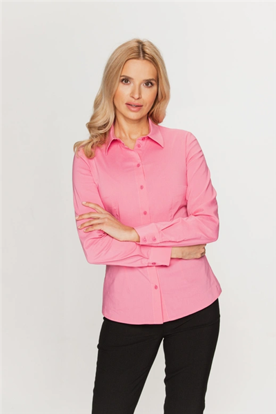 Różowa taliowana koszula z kołnierzykiem Ta elegancka koszula to niezawodny wybór na wiele okazji – od spotkań biznesowych po codzienne wyjścia. Klasyczny fason z kołnierzykiem i zapięciem na guziki został delikatnie taliowany, co sprawia, że koszula świetnie dopasowuje się do sylwetki, podkreślając jej kobiece linie. Uszyta z przyjemnej w dotyku tkaniny z dodatkiem elastanu, gwarantuje komfort noszenia przez cały dzień. Subtelny różowy kolor dodaje świeżości i lekkości stylizacji, a jednocześnie nadaje jej nowoczesnego charakteru. Świetnie prezentuje się zarówno z eleganckimi spodniami i żakietem, jak i w bardziej swobodnym zestawieniu – np. z jeansami lub wzorzystą spódnicą.