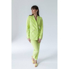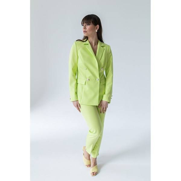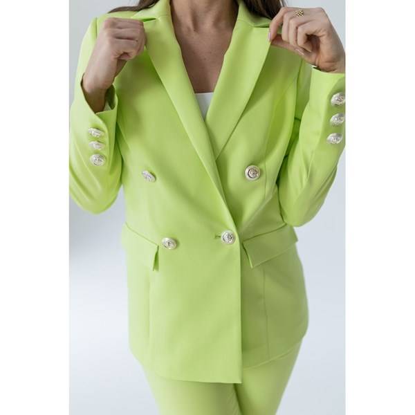 Elegancki komplet z marynarką dwurzędową z ozdobnymi złotymi guzikami. Spodnie proste z kieszeniami. Idealny na każdą okazję.