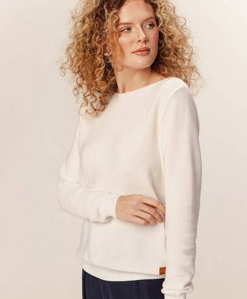 Ciepły i lekki sweter o delikatnej strukturze i z dekoltem w łódkę. Polubi się z wąskimi spodniami i długimi spódnicami. Zrobiłyśmy go ze 100% bawełny z recyklingu. Będzie Wam razem dobrze przez kilka lat na pewno. | 100% Vegan | Ethically made| INFORMACJA O FASONIE I DOPASOWANIU: Lekko poszerzony fason, z dekoltem w łódkę. Na boku skórka z naszym logo. Wybierz taki rozmiar, jaki zwykle nosisz w swetrach.