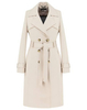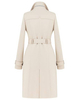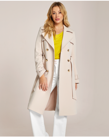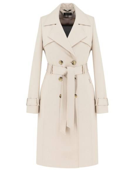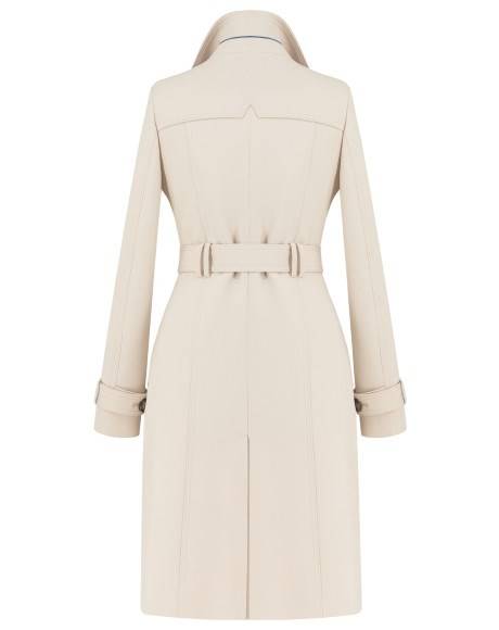 Model klasyczny typu trencz, dopasowany. Regulowany w talii paskiem. Kołnierz z klapami. Zapinany dwurzędowo na guziki. Po bokach kieszenie. Z tyłu rozporek. Płaszcz wykończony podszewką, o długości za kolano.