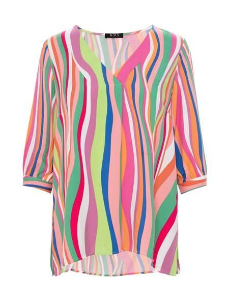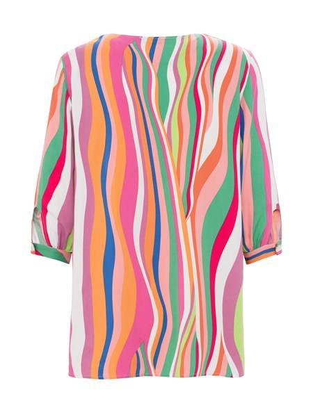 - Bluzka o prostym kroju z tkaniny wiskozowej w kolorowe pasy. Dekolt w szpic. Rękawy długości 2/3 z mankietami. Model z pęknięciami po bokach.