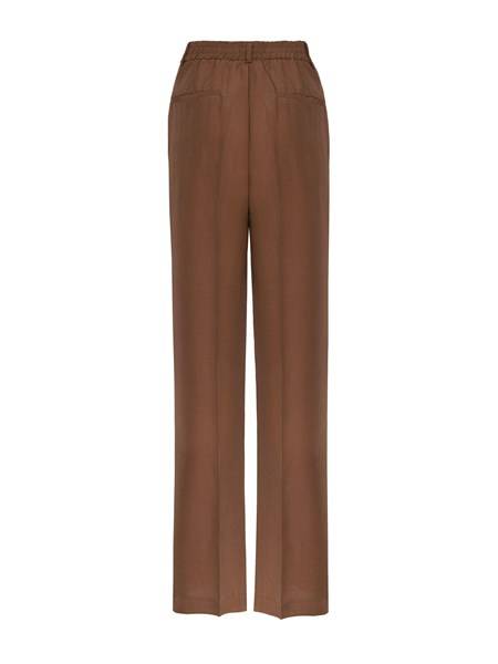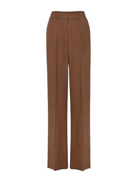 - Spodnie na kant z tkaniny lnianej w kolorze brązowym. Kieszenie po bokach. Szlufki w pasie. Zapinane z przodu na zamek i haftkę.