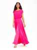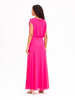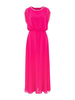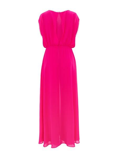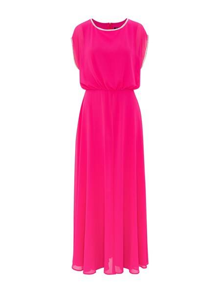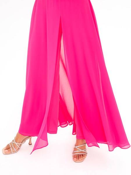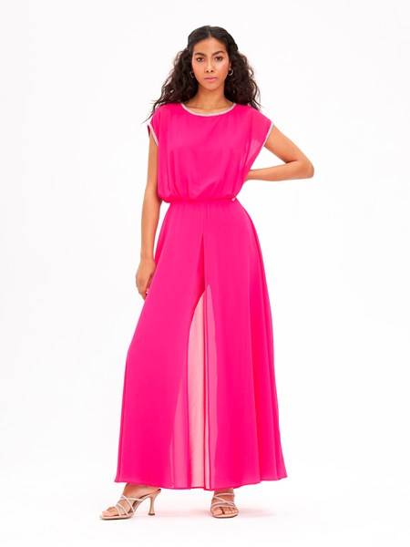 - Kombinezon o prostym kroju z gładkiej elastycznej tkaniny szyfonowej w kolorze różowym. Elastyczny pas. Krótkie rękawy. Dekolt i rękawy wykończone cyrkoniami. Szerokie nogawki. Zapinany z tyłu na kryty zamek.