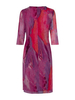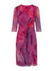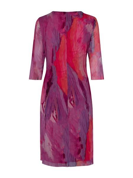 - Sukienka o dopasowanym kroju z elastycznej siatki we wzór w kolorze fioletowym. Marszczenie na boku. Dekolt w szpic. Rękawy 3/4. Model na podszewce.
