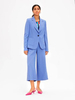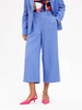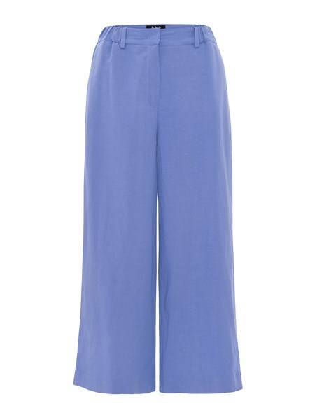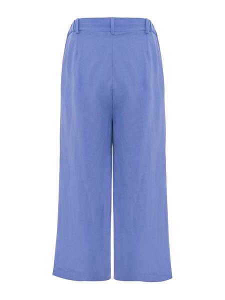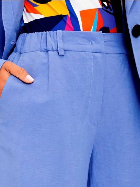 - Spodnie typu kuloty z tkaniny wiskozowej z lnem w kolorze fioletowym. Elastyczny pas ze szlufkami. Zapinane z przodu na zamek i haftkę. Kieszenie po bokach.