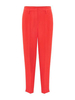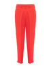 - Spodnie o prostym kroju z tkaniny lnianej z dodatkiem wiskozy w kolorze czerwonym. Nogawki z rozporkami i odszytym kantem. Zapinane z przodu na haftkę i kryty zamek. Z kieszeniami i szlufkami.
