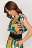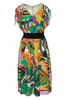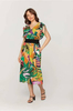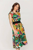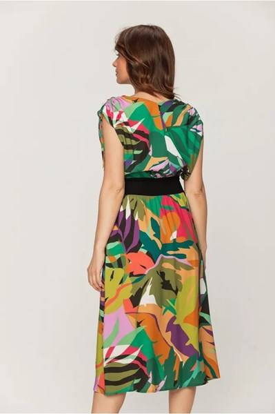 Sukienka z pęknięciami po bokach i kolorowymi nadrukami Wielobarwna sukienka z radosnymi nadrukami to idealny wybór na letnie dni, które wprowadzą w wesoły, wakacyjny nastrój. Dzięki swojej swobodnej linii, podkreślonej talii i kieszeniom w bocznych szwach, sukienka doskonale łączy komfort z modnym stylem. Model z troczkami na ramionach, trójkątnym, wysmuklającym dekoltem oraz krótkimi, ściąganymi rękawkami, zapewnia pełną swobodę ruchów. Pęknięcia po bokach dodają całości lekkości i nowoczesnego charakteru. Wykonana w 100% z wiskozy, sukienka wyróżnia się kolorowymi printami, które idealnie wpisują się w letnią atmosferę i dodają energii każdej stylizacji.