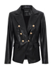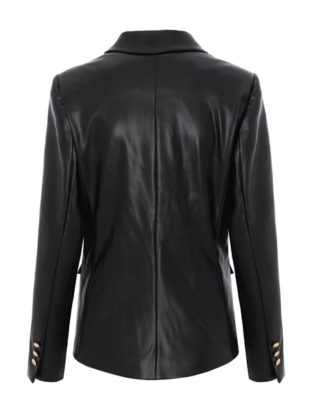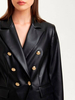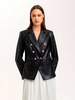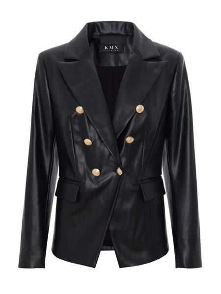 - Marynarka dwurzędowa o dopasowanym kroju z imitacji skóry w kolorze czarnym. Wykładany kołnierz. Kieszenie z klapami. Długie rękawy. Ozdobne guziki. Model na podszewce.