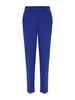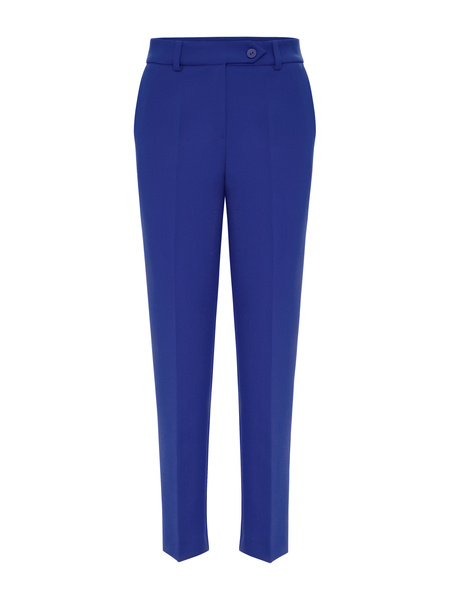 - Spodnie o prostym kroju na kant z elastycznej tkaniny wiskozowej w kolorze chabrowym. Zapinane na guzik i zamek. Kieszenie po bokach i z tyłu.