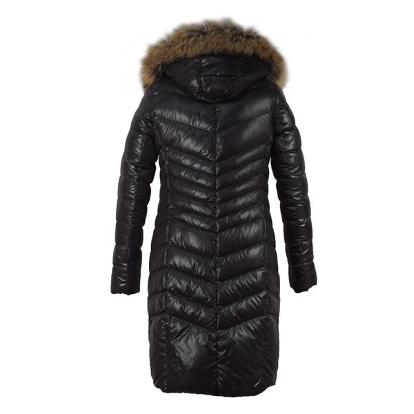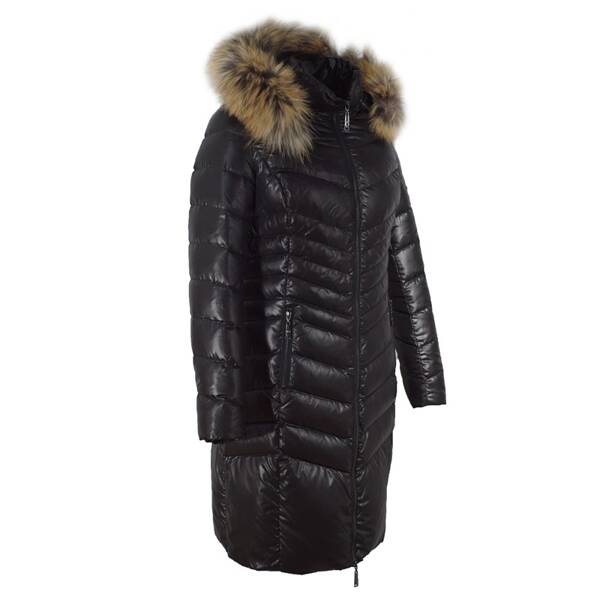 Nowoczesna i efektowna kurtka o wydłużonej formie, sięgająca za kolana, w kolorze klasycznej czerni. Wykonana z tkaniny poliestrowej o delikatnym połysku. Wypełnienie naturalnym pierzem zapewnia doskonałą ochronę przed chłodem, wiatrem i mrozem. Modne pikowania potęgują efekt ochrony przed zimnem ale też wyszczuplają sylwetkę. Prosty, lekki krój. Obszerny dosuwany kaptur wykończony dosuwaną listwą z naturalnego futra z jenota gwarantuje elegancki i luksusowy wygląd. Całość zapinana na dwustronny suwak w kolorze ciemnego niklu. Posiada dwie kieszenie zapinane na suwak. Długość płaszcza do kolan. Prosta, uniwersalna forma sprawdza się w wielu połączeniach – zarówno ze stylem eleganckim, jak i sportowym. Wygląda równie dobrze na różnych typach sylwetek. Ponadczasowy fason sprawdzi się przez wiele lat.