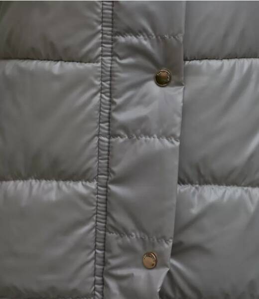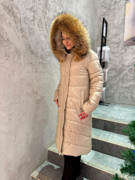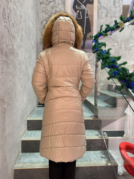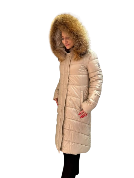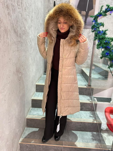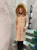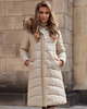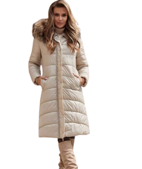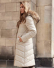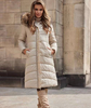 uwadze długą beżową kurtkę do kolana wypełnioną ekopuchem, który zapewni Ci