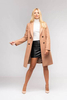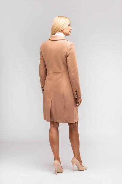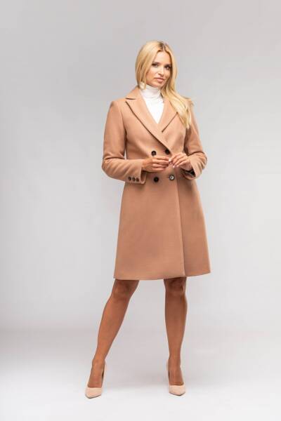 Płaszcz m533 to klasyczna dwurzędowa damska dyplomatka, ma wąskie klapy i kołnierz oraz wąskie kieszenie w ozdobnych ramkach. W tyle zastosowane zostały cięcia podkreślające delikatnie kobiece kształty oraz rozporek dla wygody ruchu. Rękawy wykończone są ozdobną stebnówką i guzikami.