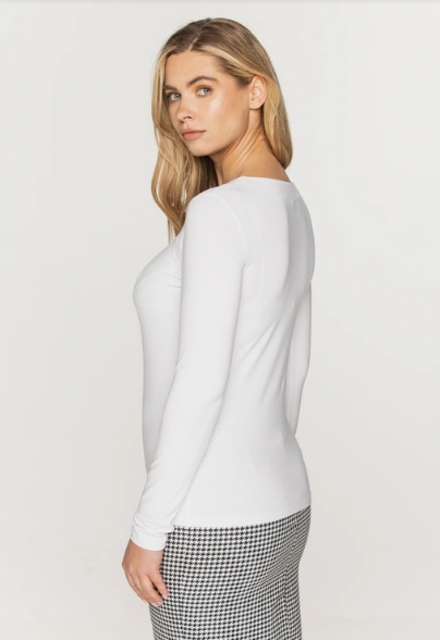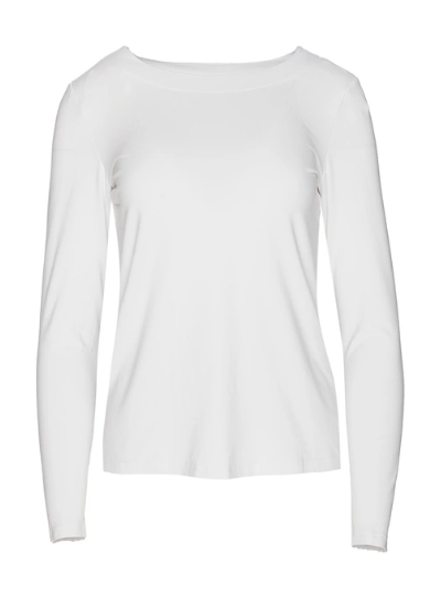Klasyczna, dopasowana bluzka z długim rękawem wykonana z elastycznej, miękkiej dzianiny o składzie 92% wiskozy i 8% elastanu. Gładka, biała tkanina pięknie układa się na sylwetce, podkreślając jej kształty. Okrągły dekolt dodaje jej uniwersalnego charakteru – idealna zarówno do eleganckich stylizacji, jak i na co dzień pod marynarkę.