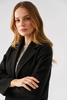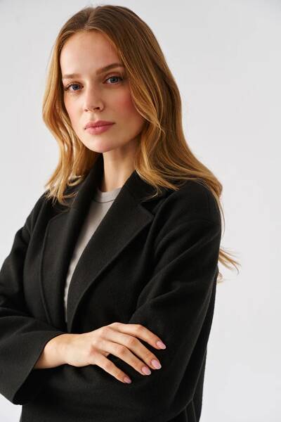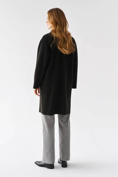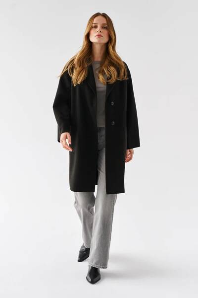 Płaszcz bez podszewki o luźnym kroju. Zapinany na dwa guziki. Kieszenie w szwach bocznych. Wszystkie krawędzie wykończone na surowo