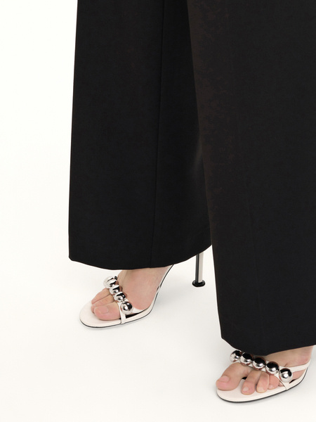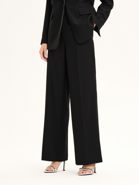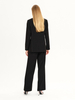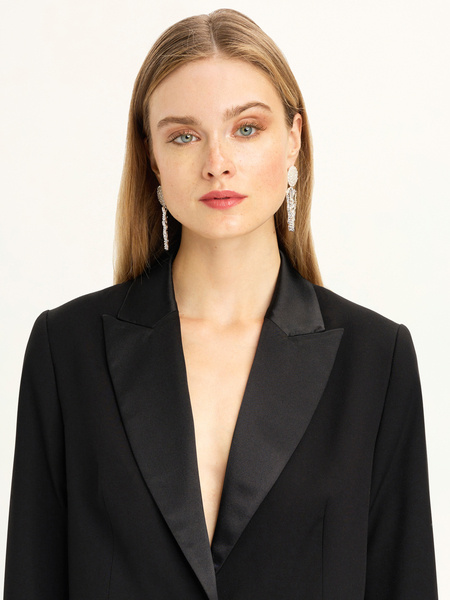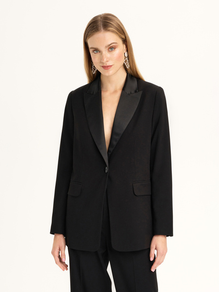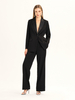 • Garnitur oversize z zaznaczoną talią z elastycznej tkaniny wiskozowej w kolorze czarnym. Kołnierz z satynowymi klapami. Spodnie o szerokim kroju. Zapinane na zamek i guzik. Kieszenie po bokach. Wstawki satynowe przy kieszeniach. Model na podszewce.